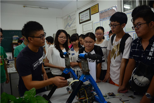 当志愿者带领新生走进通信电子实验基地的时候,新生瞬间被里面各种“奇怪”的作品吸引了,“这个是我们自己做的作品:《多功能智能浇花装置》,作为江西省推荐参赛的队伍之一,我们华都娱乐场