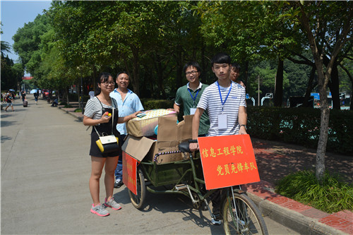 建立“党员先锋”三轮车分队,帮助新生分担沉重的行李,为新生及家长提供了很大便利。