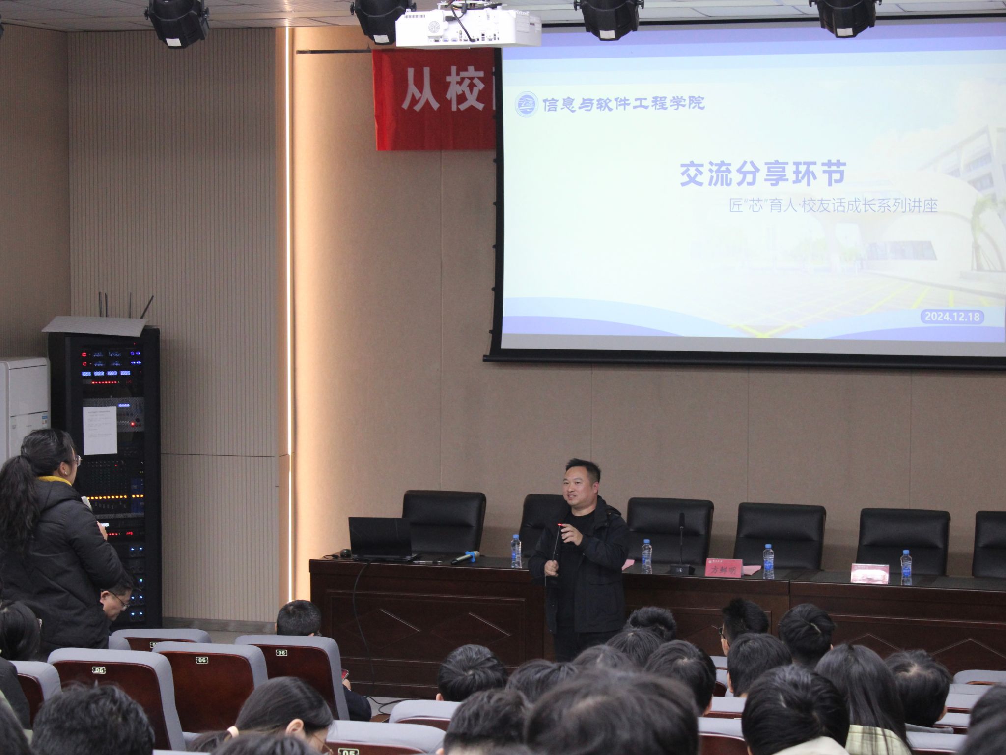 在互动交流环节,同学们踊跃提问,围绕专业发展、未来就业形势、能力提升、考研方向等多个方面提出疑问。两位校友结合自身经验,以耐心细致的解答为同学们提供了切实可行的建议,为大家解答了成长路上的困惑。
