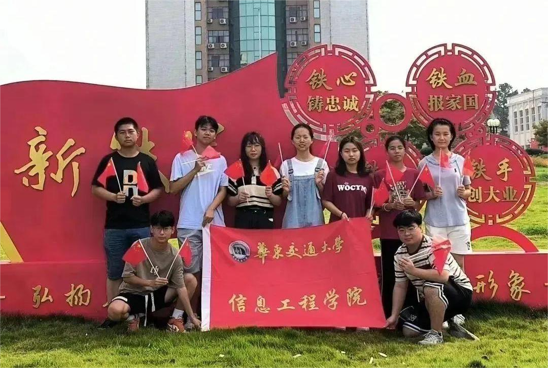 特色地标建筑前与国旗合影,以多种方式表达信息学子的殷殷爱国之情。