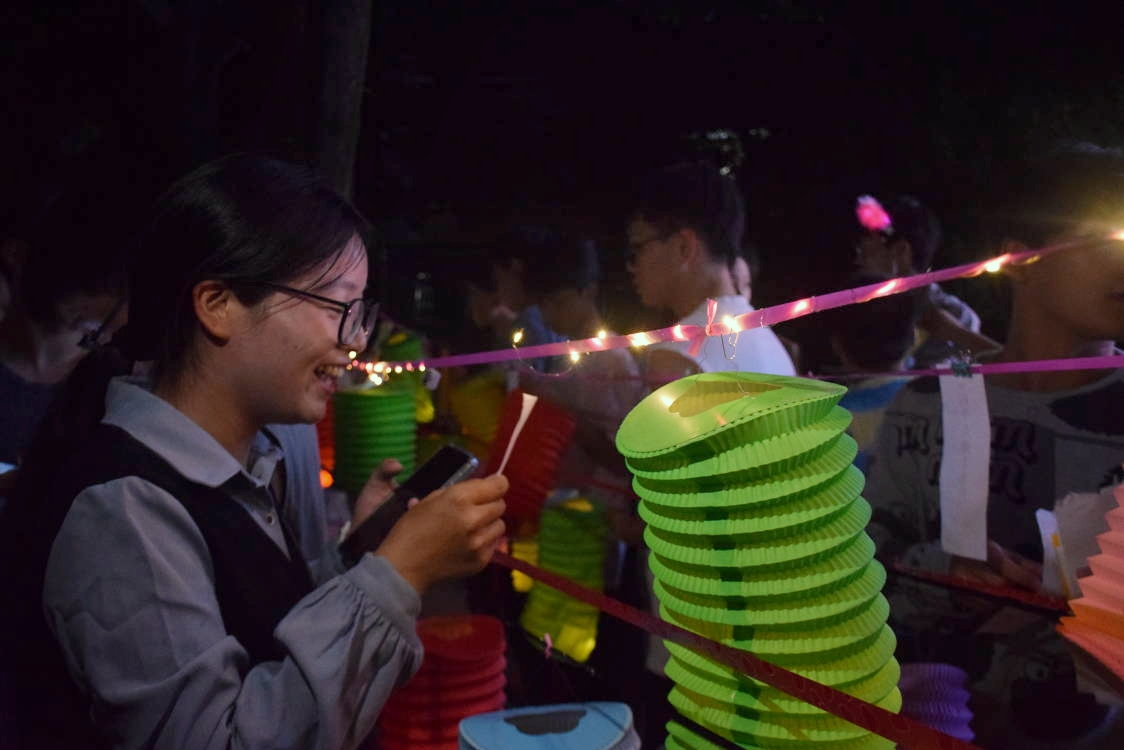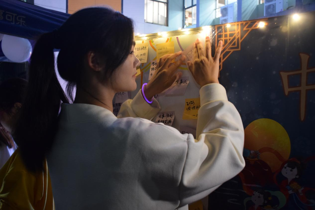 夜幕降临,月上中天,中秋灯谜活动正式开始。同学们积极参与各项活动,对着灯谜深思熟虑,近距离感受中华传统文化的魅力;制作小桔灯和团扇,享受创作的乐趣,体验中秋节独有的韵味:寄出亲手书写的家书,一字一句,吐露出对家人的思念;在心愿板上写下自己的愿望,一笔一划,表达出对生活充满期许,对未来充满希望,对华交饱含热爱。