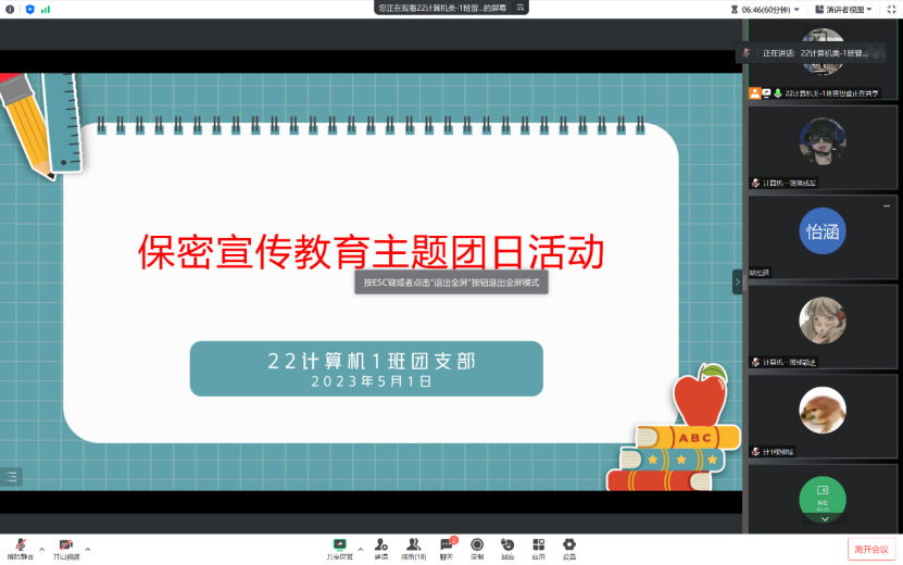 各团支部在“五四”青年节期间开展线下线上相结合的保密主题团日活动。各团支书从什么是保密、开展保密教育的意义、怎样做好安全保密工作三方面做了详细介绍,组织支部全体团员共同观看2023年保密公益宣传片,通过观看短视频的方式从保密科普教育和保密传统教育两方面深入学习安全保密知识。