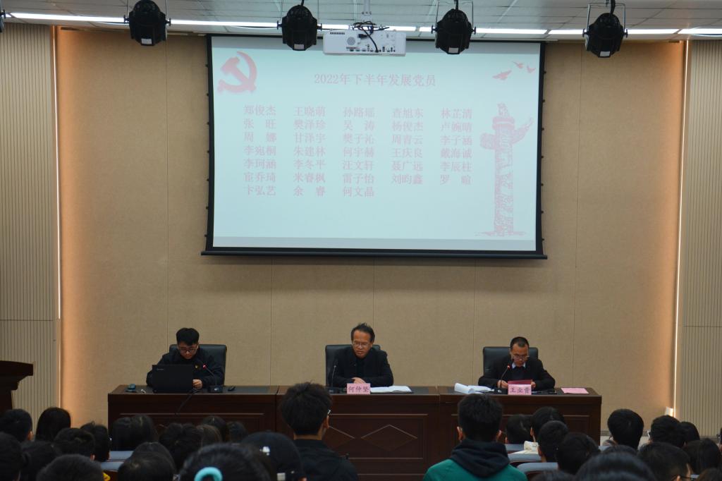 全体新生党员进行了入党宣誓,何仲坚给新发展党员赠书,老党员为新发展党员佩戴党员党徽,新发展党员代表在发言中表示在新起点,将以更高的使命感、责任感严格要求自己。