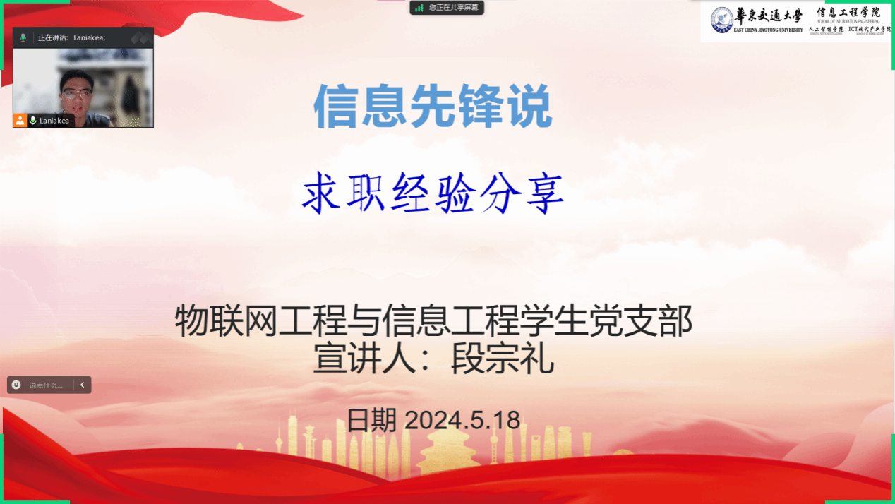 举办“信息先锋说”第三十四期交流分享会,此次会议由物联网工程与信息工程学生党支部主持。本次分享会以分享求职经验为主题,由段宗礼同志进行分享。2023级人工智能一、三班全体同学参会。