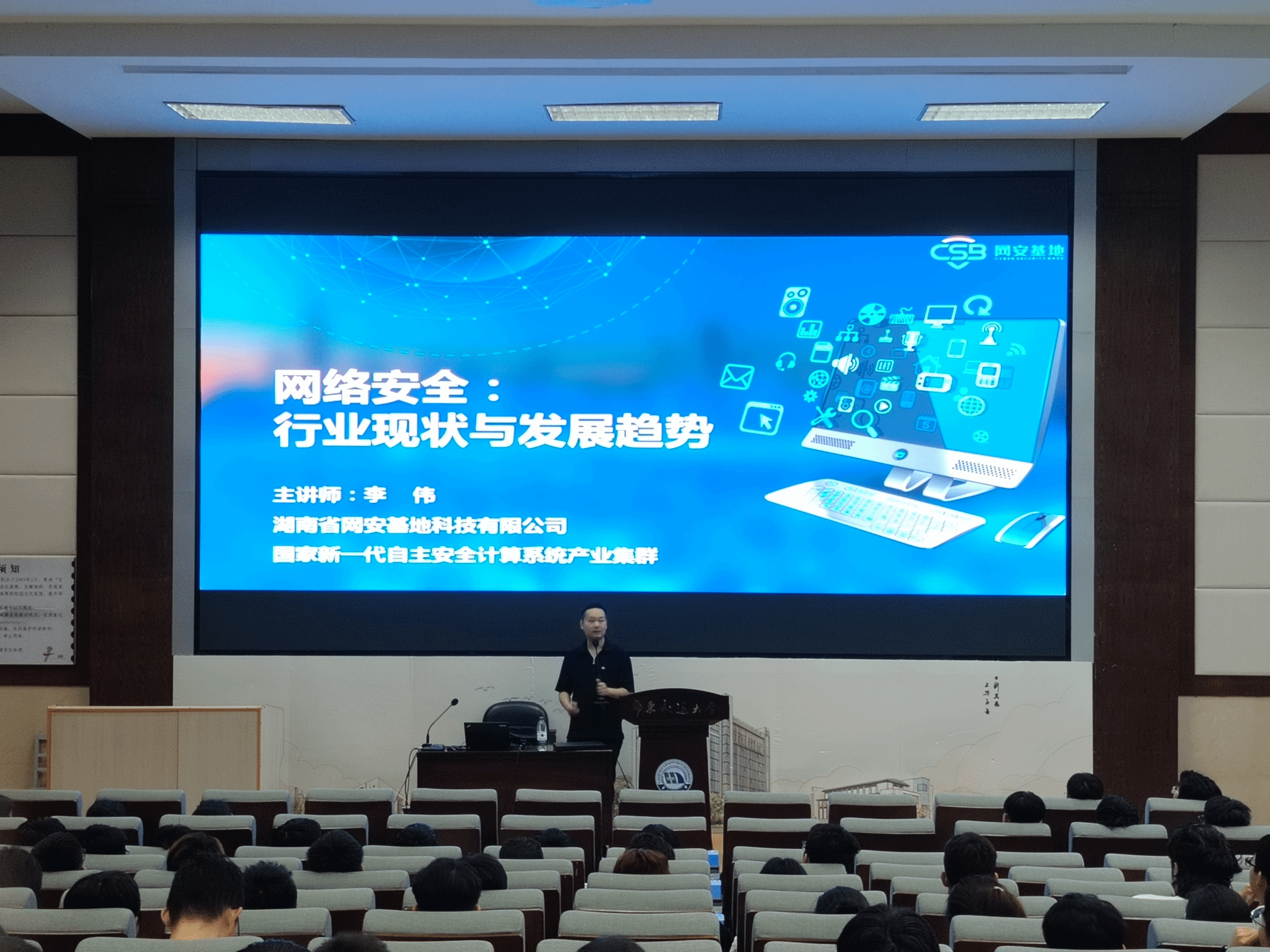 本次讲座由湖南省网安基地科技有限公司联合创始人李伟主讲。讲座伊始,李伟就网络安全行业的现状和发展趋势进行了全面而深入的讲解。他强调,随着信息技术的飞速发展,网络安全已经成为国家安全的重要组成部分,对国家安全、社会稳定和经济发展都具有举足轻重的意义。同时,他指出,随着网络安全问题的日益凸显,国家对网络安全人才的需求也在持续增长。他详细罗列了网络安全专业的就业前景和发展方向,让同学们对未来的职业规划有了更加清晰的认识。他鼓励同学们积极学习网络安全知识,掌握网络安全技能,为未来的职业生涯打下坚实的基础。