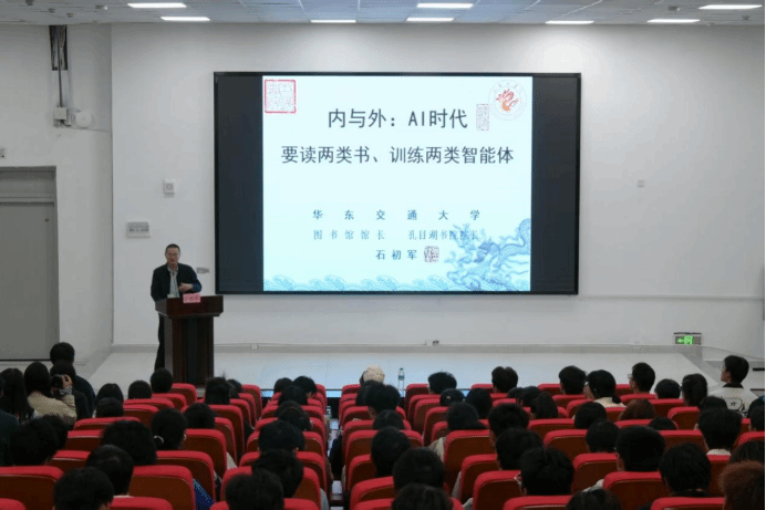 于进贤教学点教学楼509报告厅举办人工智能科普系列讲座。活动特邀图书馆馆长、孔目湖书院院长石初军主讲,带来了一场关于“内与外”的深度对话——《AI时代要读两类书、训练两类智能体》。