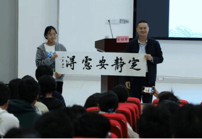 讲座中,石初军通过“人,是如何成为万物之灵的?”——一个问题引起同学们的思考,随后从人类的发展史观察切入,讲述了人如何因“变”而强,因“不变”而灵,变的是工具,是技术,是外在的世界;不变的,是仁爱,是诚信,是内在的精神。他指出,大学生要多读两类书:一类是“外用之书”,让我们在时代的浪潮中立足;另一类是“内体之书”,让我们在纷扰的世界中安心。随后,他谈及学生需要训练两类智能体,教导同学们要修身、要念、会抄、肯练,从内而外地锻炼自己的身体。现场同学踊跃发言,石初军向每位回答问题的同学赠出墨宝。
